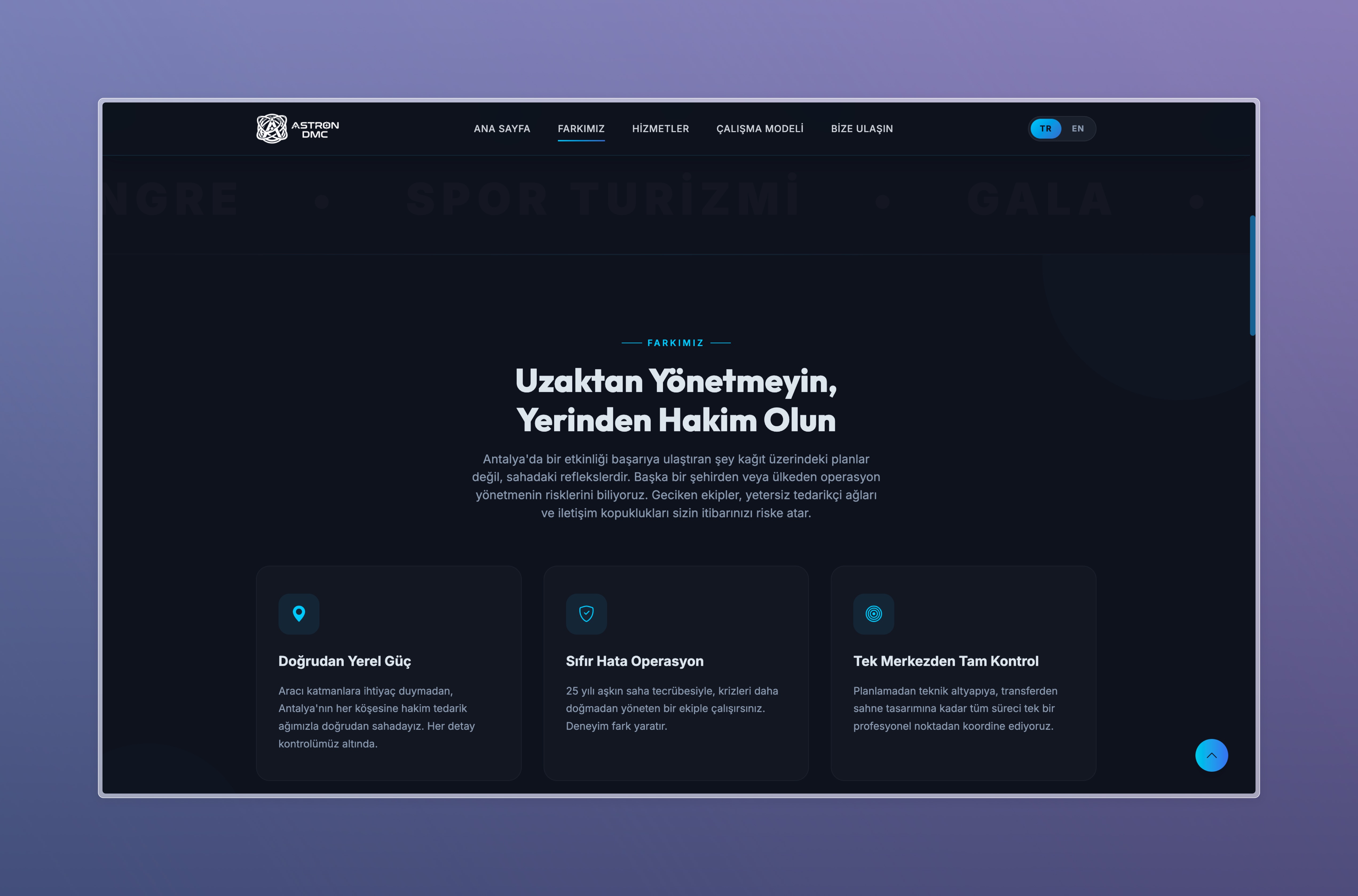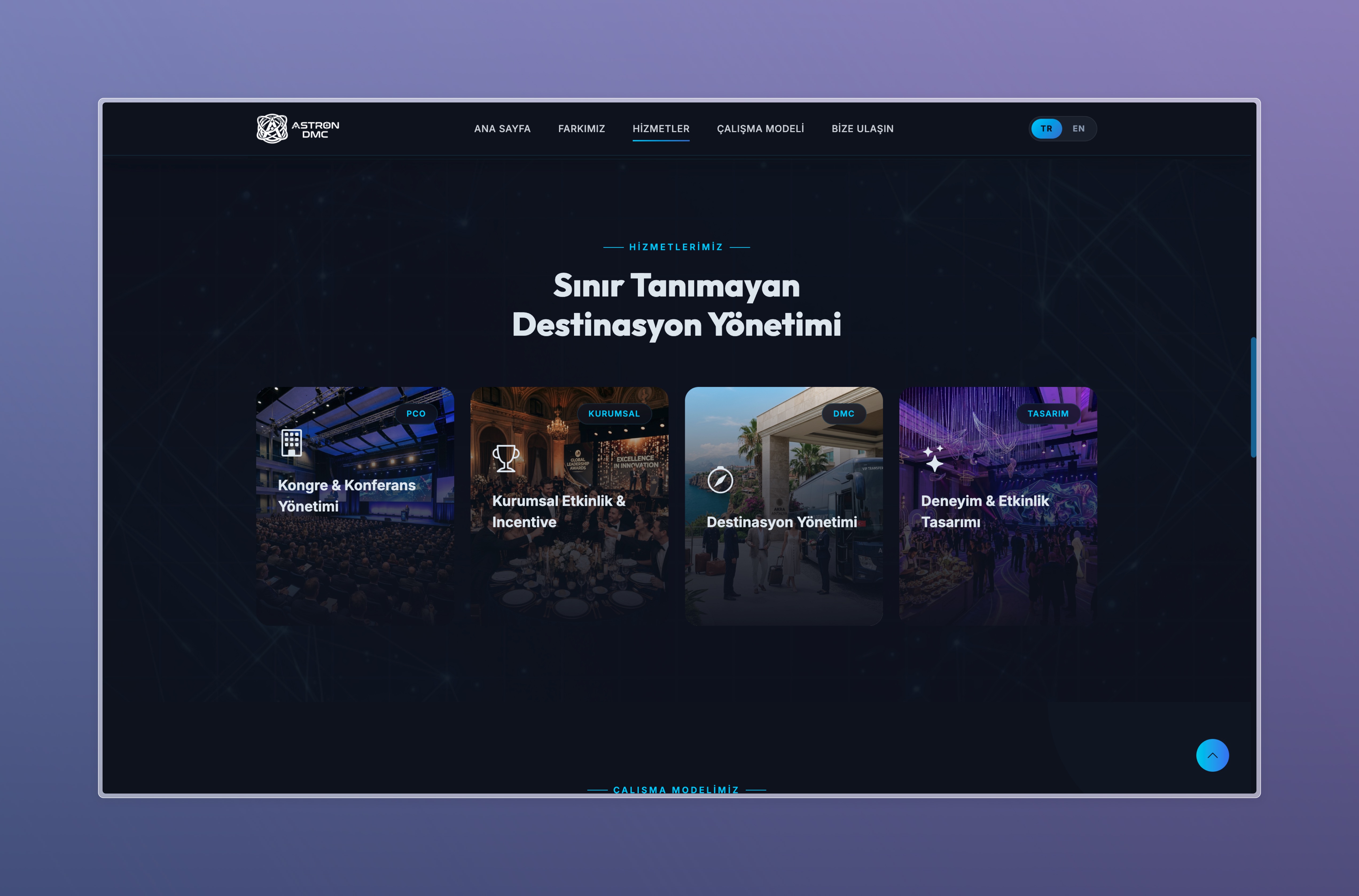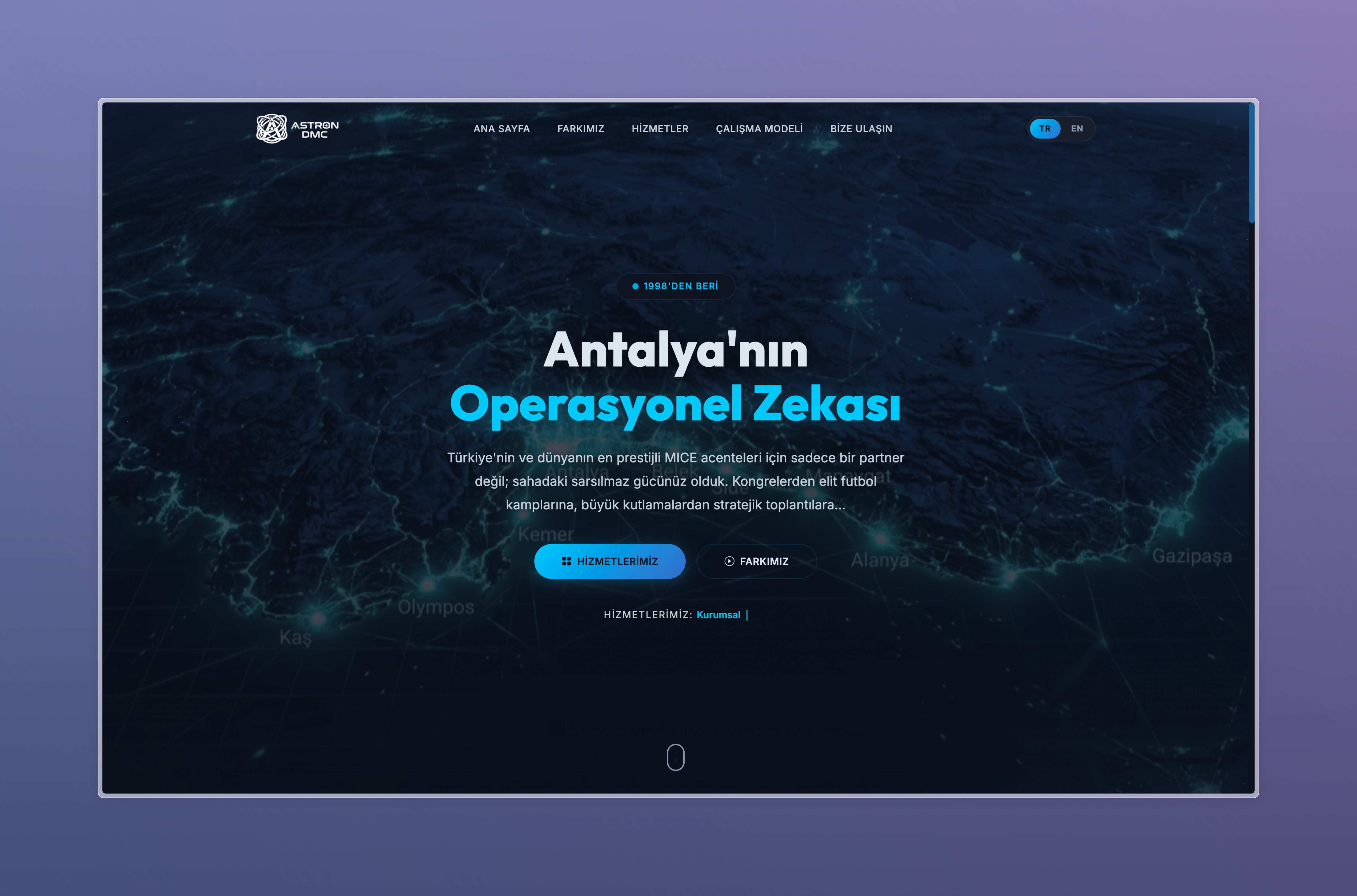 Astron DMC için geliştirdiğimiz bu proje, uluslararası MICE (Meetings, Incentives, Conferences, Events) ve organizasyon süreçlerini yönetmek üzere tasarlanmış kurumsal web ve dijital altyapı çözümüdür.