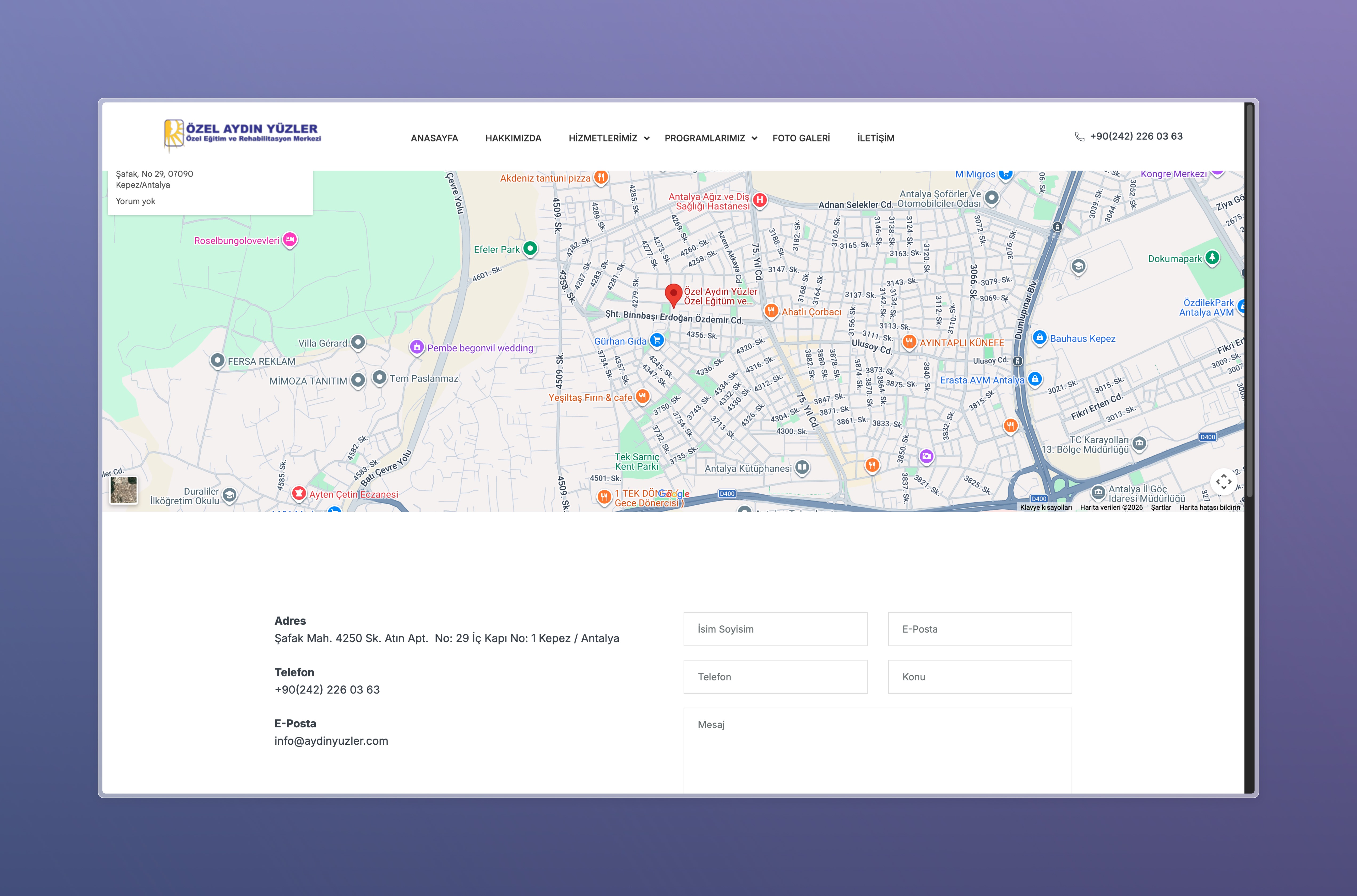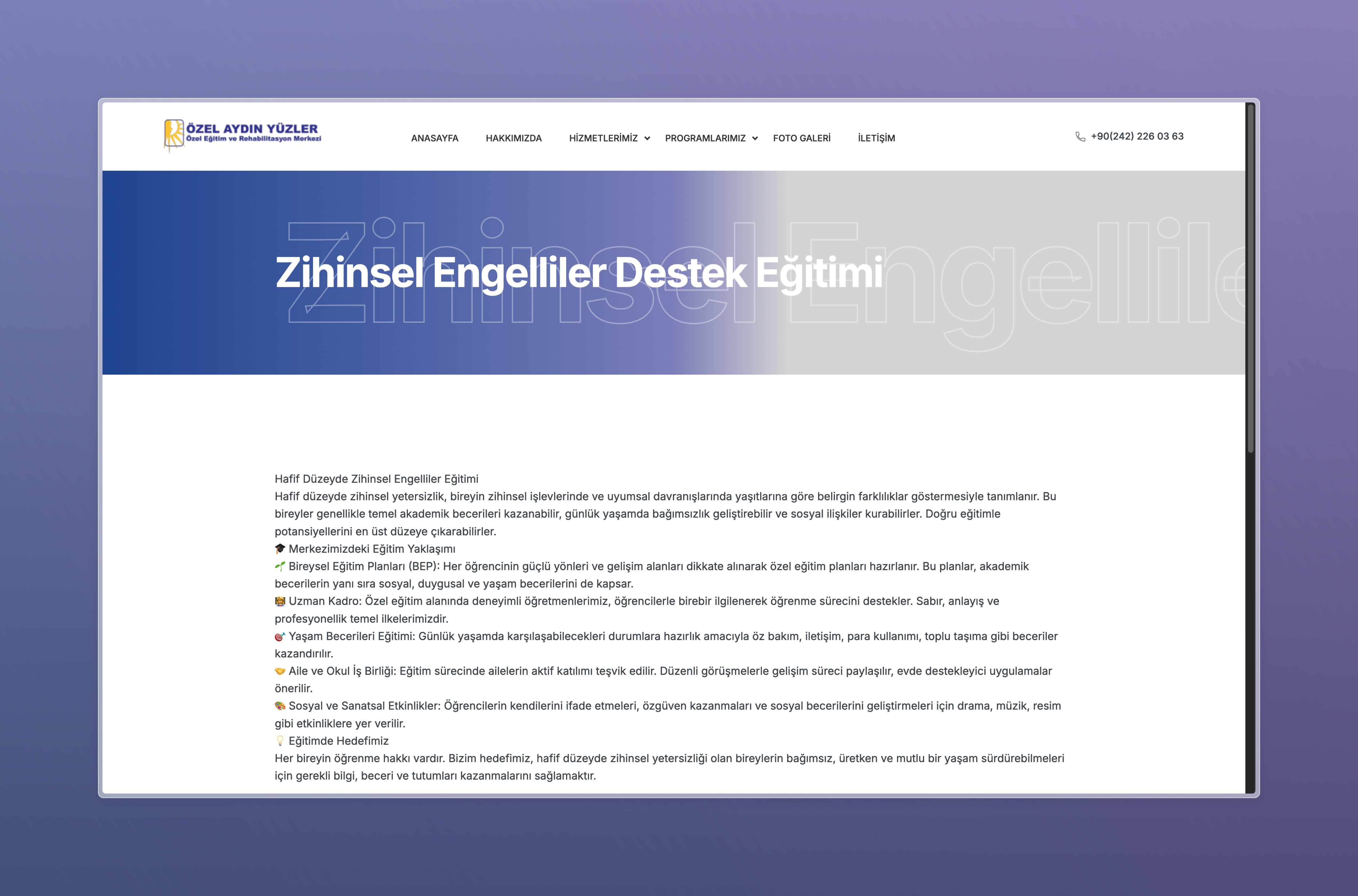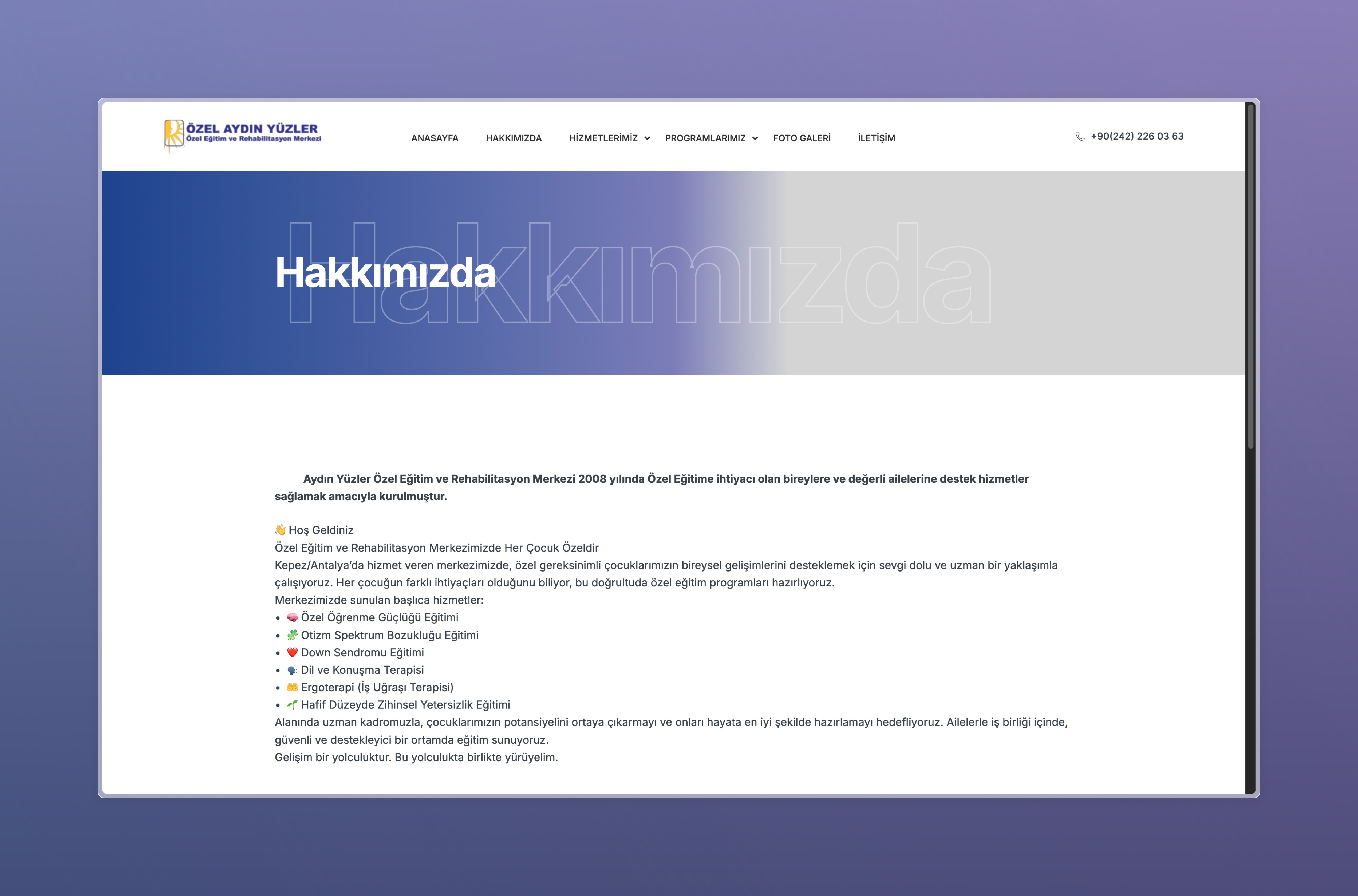 Aydın Yüzler için geliştirilen web platformu, özel eğitim ve rehabilitasyon hizmetlerinin dijital ortamda doğru, anlaşılır ve güven veren bir şekilde sunulmasını sağlamak amacıyla tasarlanmıştır.